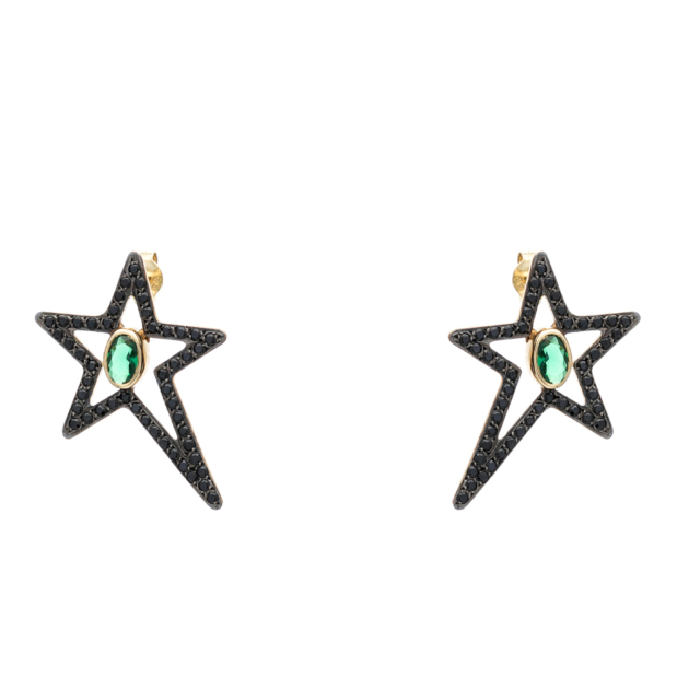 Σκουλαρίκια Αστέρια Κίτρινο Χρυσό 14Κ με Μαύρα και Πράσινα Ζιργκόν και Μαύρο Επιπλατίνωμα