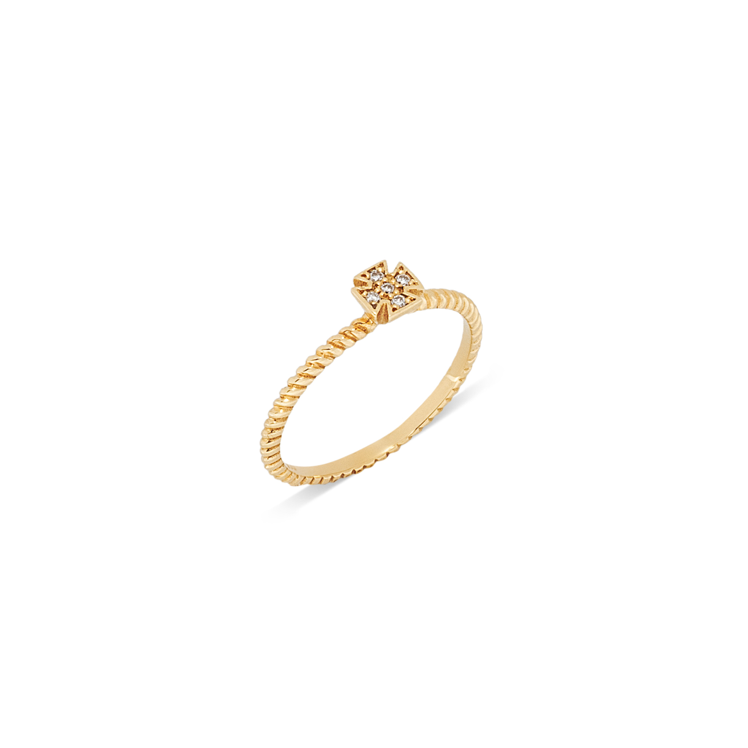 Description Ring in 18K yellow gold in a thin rope design adorned with a cross filled in with brilliant cut diamonds