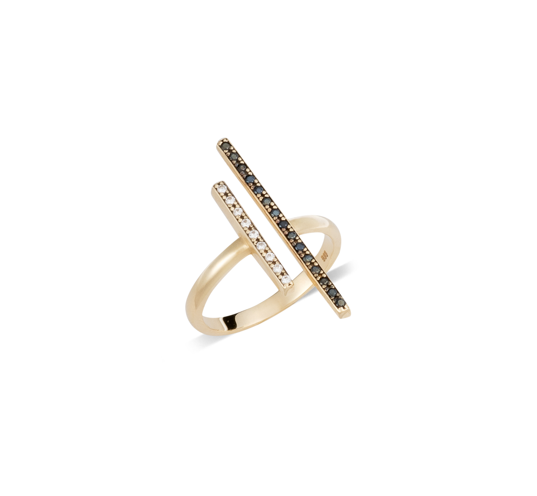 Description Ring in 14K yellow gold in a bar design adorned with white and black zircons