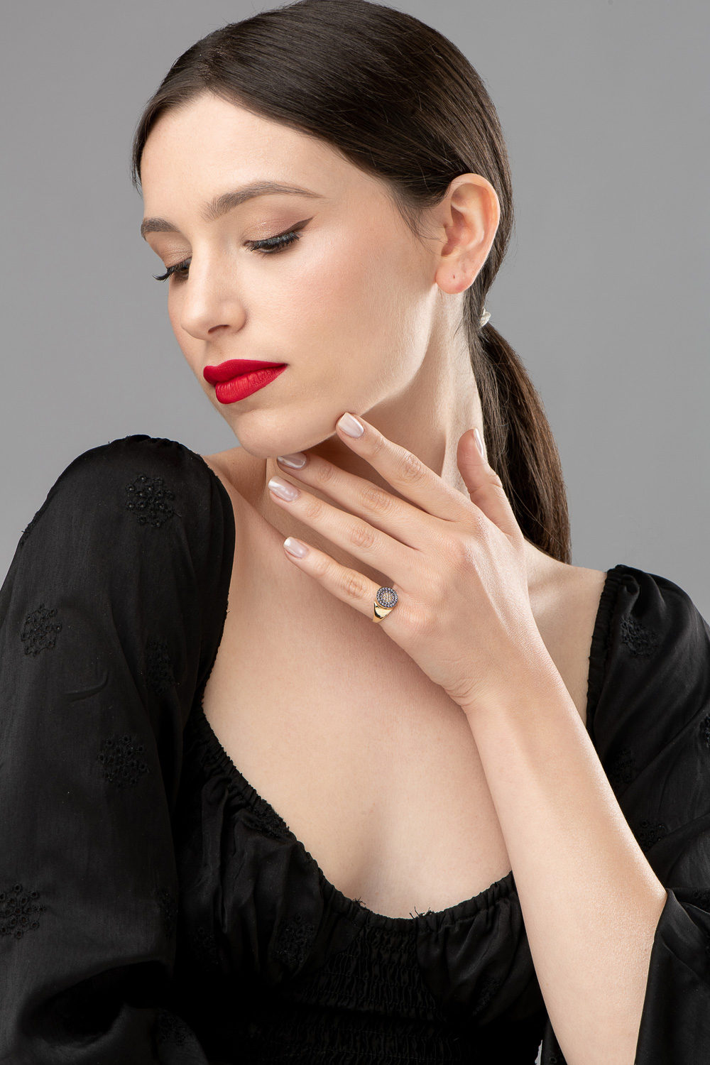 Description Chevalier ring in 14K yellow gold in a round motif adorned with blue and purple zircons