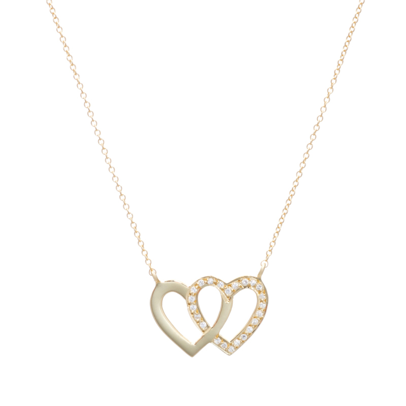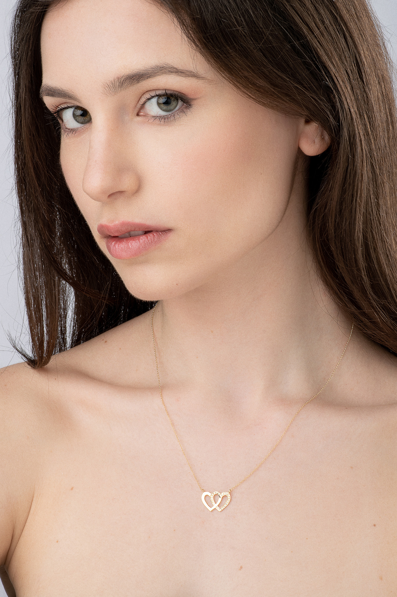 Description Pendant in 14K yellow gold featuring two hearts with zircons in a combination of matte and polish finish
