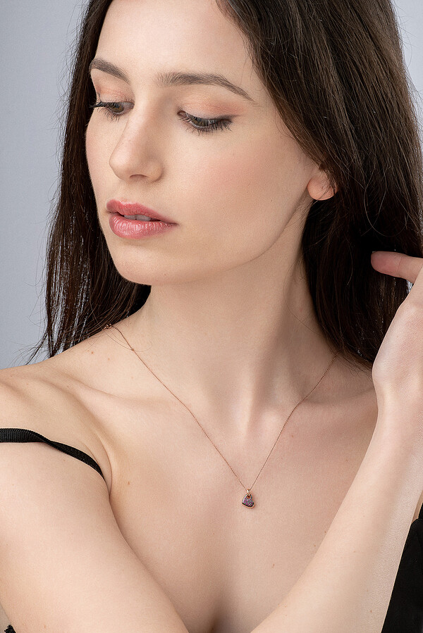 | Description | Pendant in 14K rose gold featuring a heart with red zircons |
