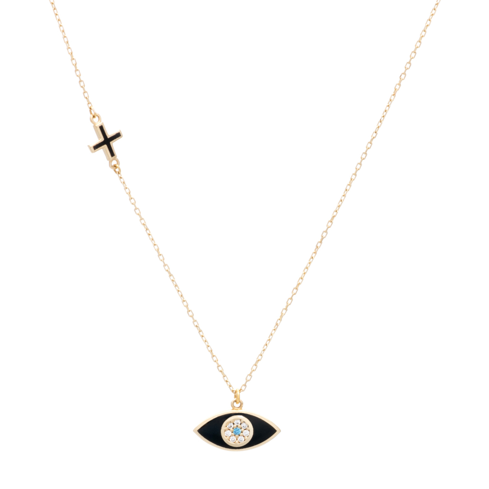 Black Enamel Evil Eye Pendant 14K Yellow Gold with Zircons & Cross