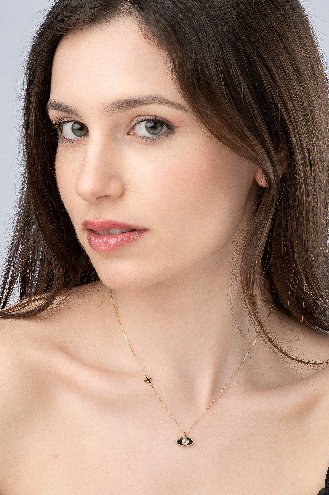| Description | Pendant in 14K yellow gold with a black enamel cross and an evil eye adorned with white and light blue zircons |