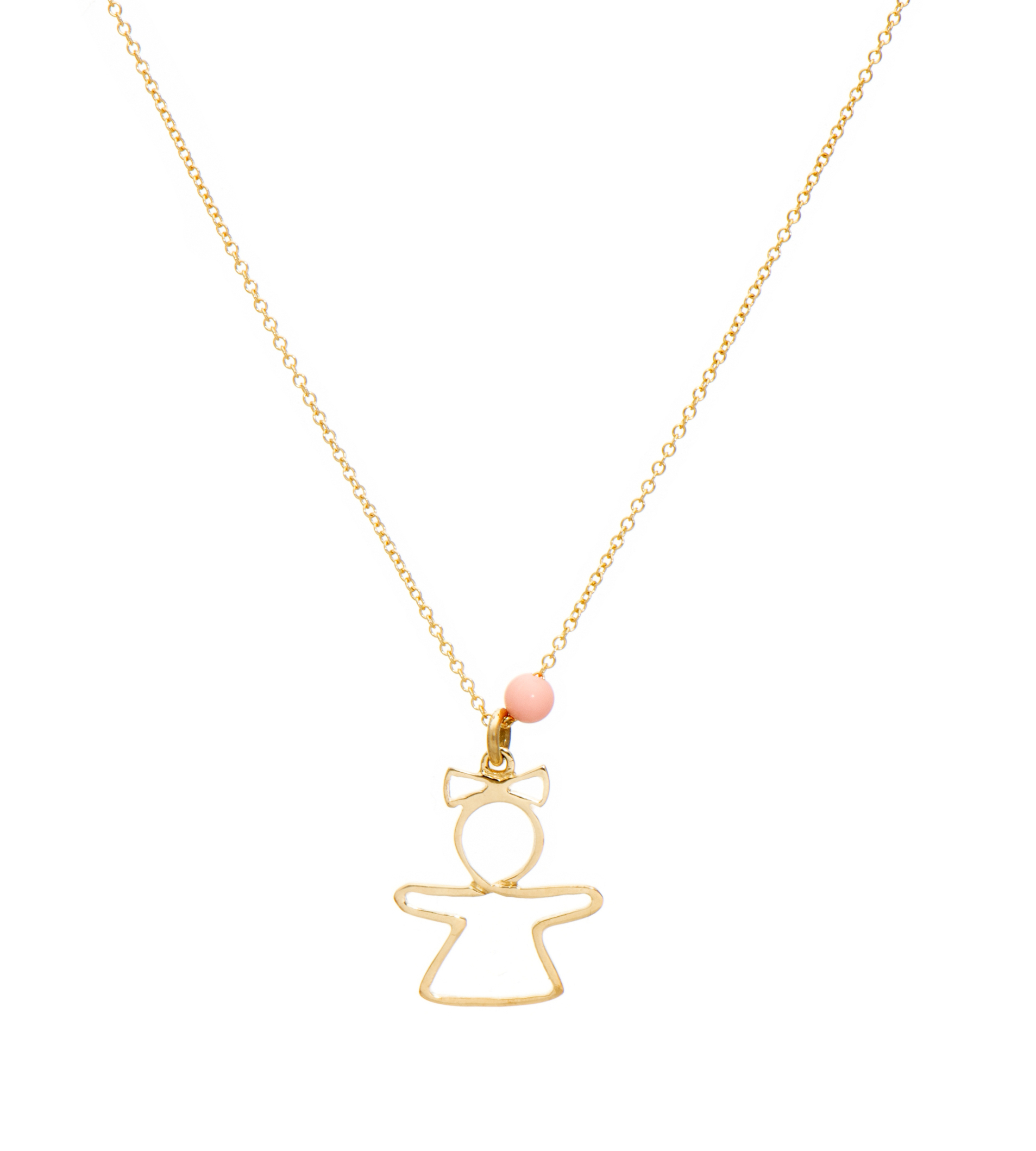 Description Pendant in 14K yellow gold featuring a girl decorated with a pink stone