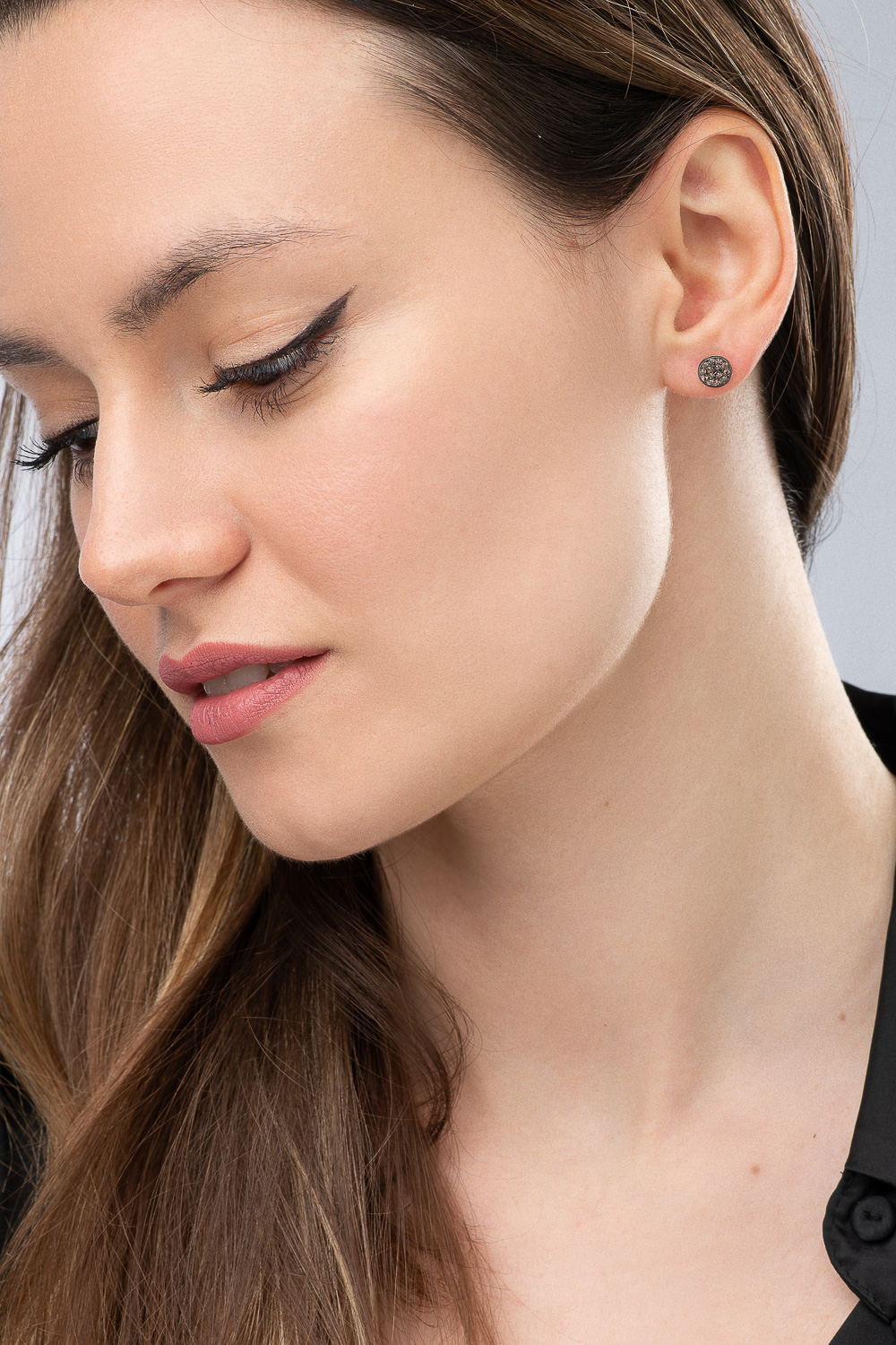 | Description | Stud earrings in 14K yellow gold in a circular motif filled in with brown zircons and black platinum plating |
