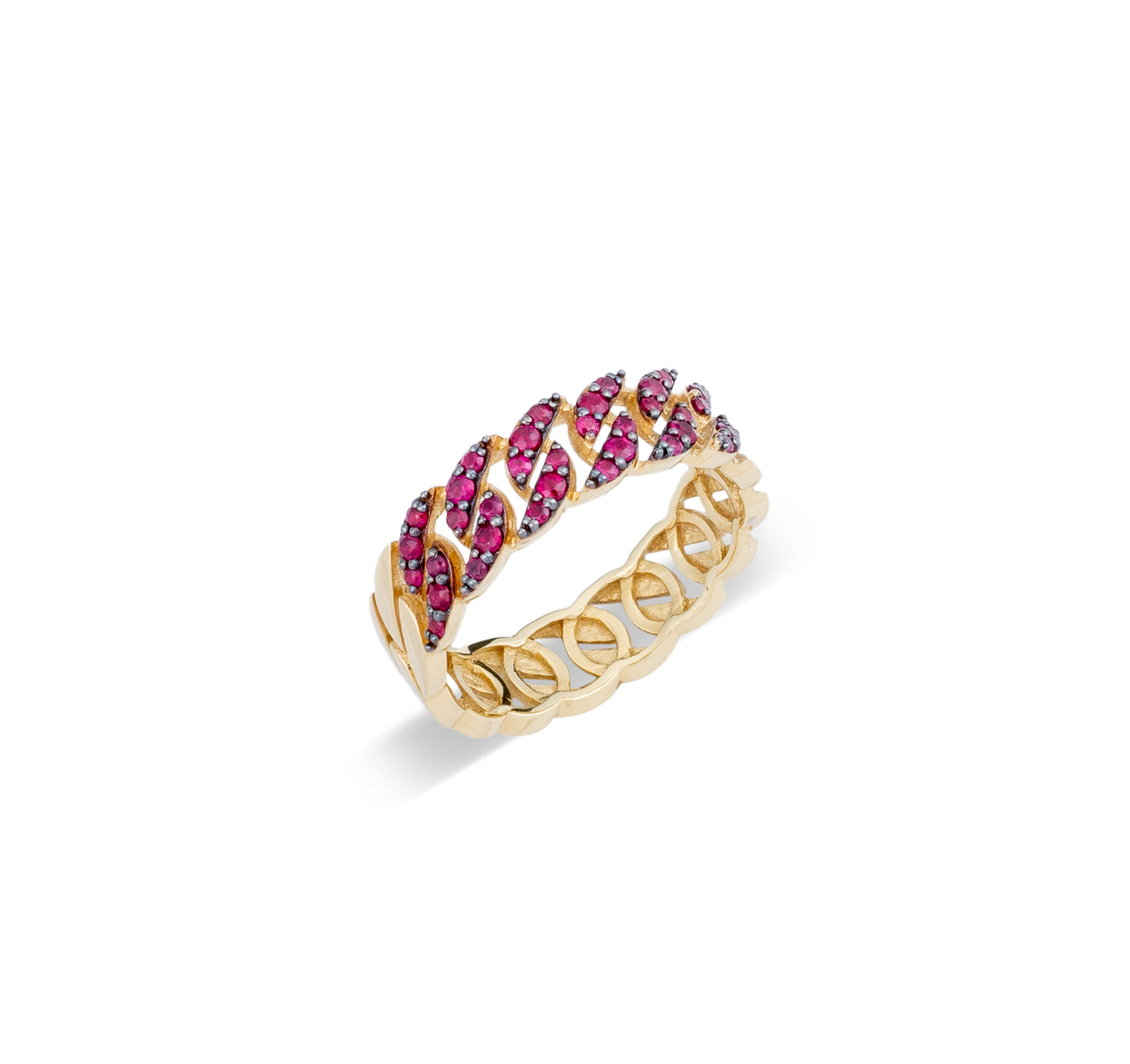 | Περιγραφή | Δαχτυλίδι χρυσό κίτρινο 18Κ αλυσιδωτό με ρουμπίνια 0.53ct σε ένα ιδιαίτερο σχέδιο. |