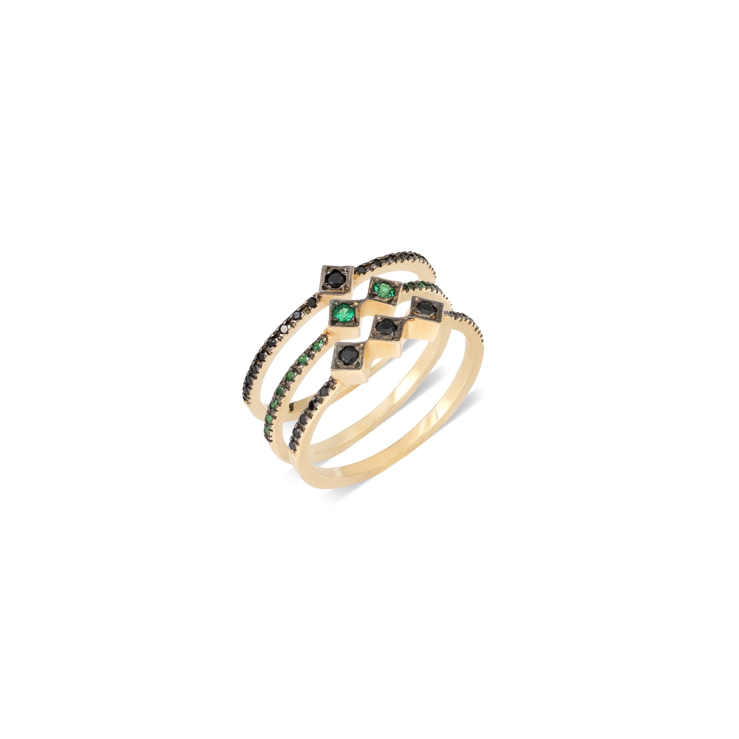 Περιγραφή Δαχτυλίδι τριπλό από κίτρινο χρυσό 14Κ με μαύρο επιπλατίνωμα και συνδυασμό μαύρων και πράσινων ζιργκόν