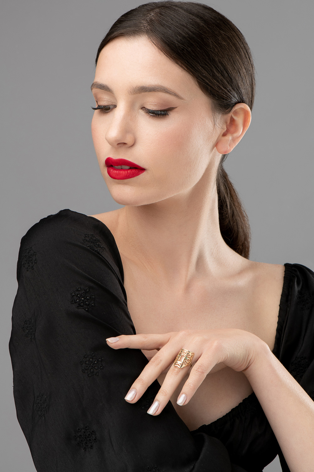 | Περιγραφή | Δαχτυλίδι σε κίτρινο χρυσό 14Κ σε διάτρητο σχέδιο πάνθηρα με πράσινα ζιργκον |