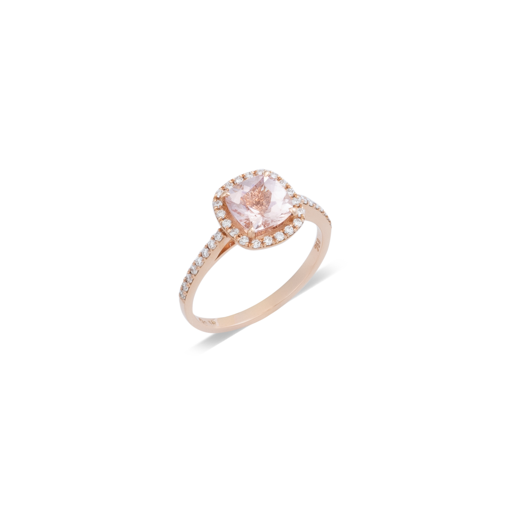 Περιγραφή Δαχτυλίδι από ροζ χρυσό 18Κ διακοσμημένο με διαμάντια και μοργκανίτη