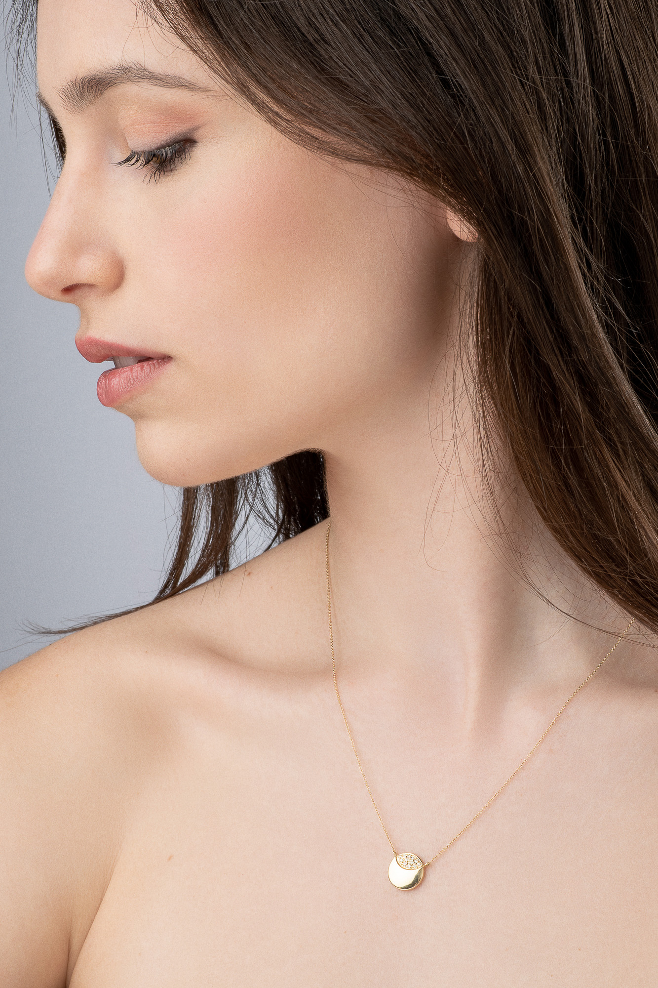 | Περιγραφή | Μενταγιόν από κίτρινο χρυσό 14 καρατίων σε κυκλικό σχήμα διακοσμημένο με λευκά ζιργκόν. |