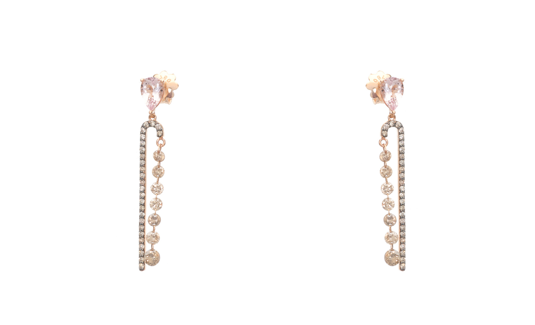 Περιγραφή Σκουλαρίκια από ροζ χρυσό 18Κ διακοσμημένο με διαμάντια σε κοπή μπριγιάν και μοργκανίτη
