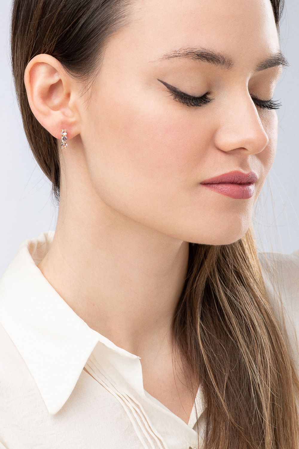 Περιγραφή Σκουλαρίκια κρίκοι από κίτρινο χρυσό 14Κ με τρεις εντυπωσιακούς λίθους Μοργκανίτη