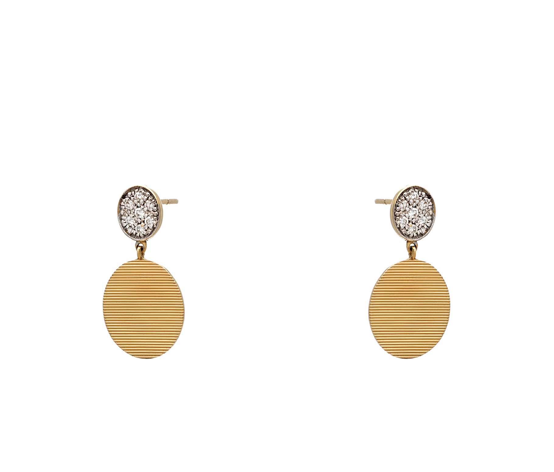 | Περιγραφή | Ιδιαίτερο σκουλαρίκι σε κίτρινο και λευκό χρυσό 18Κ κρεμαστό οβάλ με 0,14ct διαμάντια |