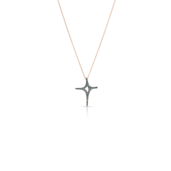 Περιγραφή Σταυρός 18Κ ροζ χρυσό σε ένα ιδιαίτερο σχέδιο με μπλε μπριγιάν