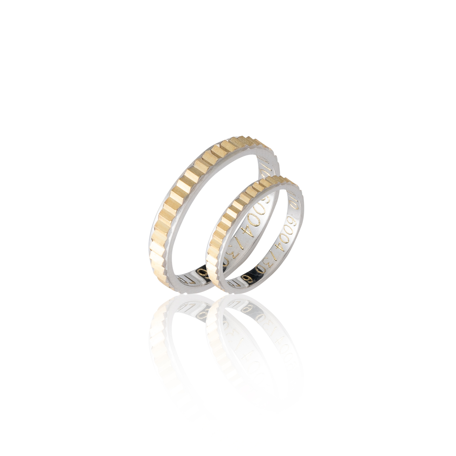 Περιγραφή Βέρες δίχρωμες από κίτρινο και λευκό χρυσό 14Κ σε ένα μοντέρνο χαρακτηριστικό σχέδιο από ανάγλυφες γραμμές