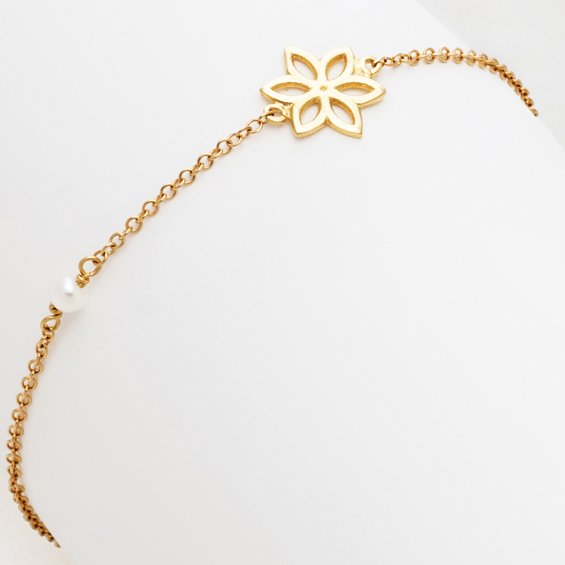 Περιγραφή Βραχιόλι σε κίτρινο χρυσό 14Κ σε κομψό σχέδιο λουλούδι διακοσμημένο με μαργαριτάρι.